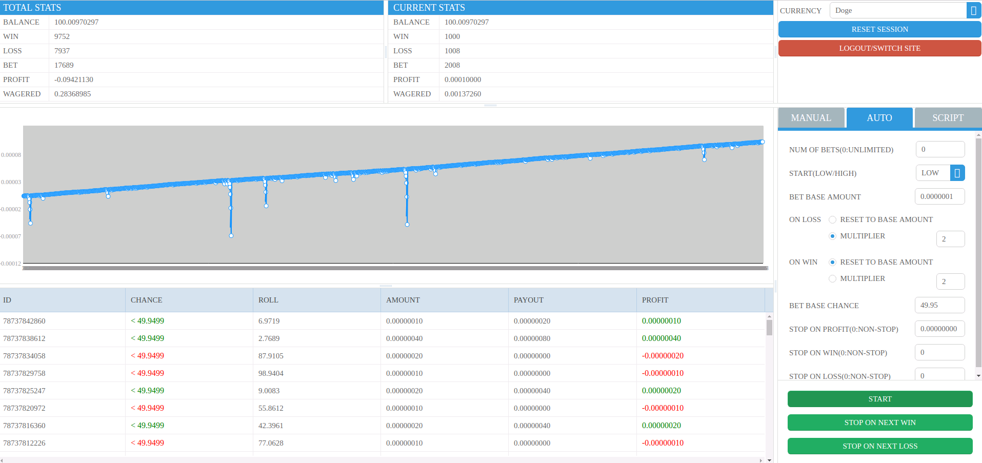 MyDiceBot is amazing! I've used it to play against Primedice's Official Promotions, and earned a lot of Bitcoin and Dogecoins!